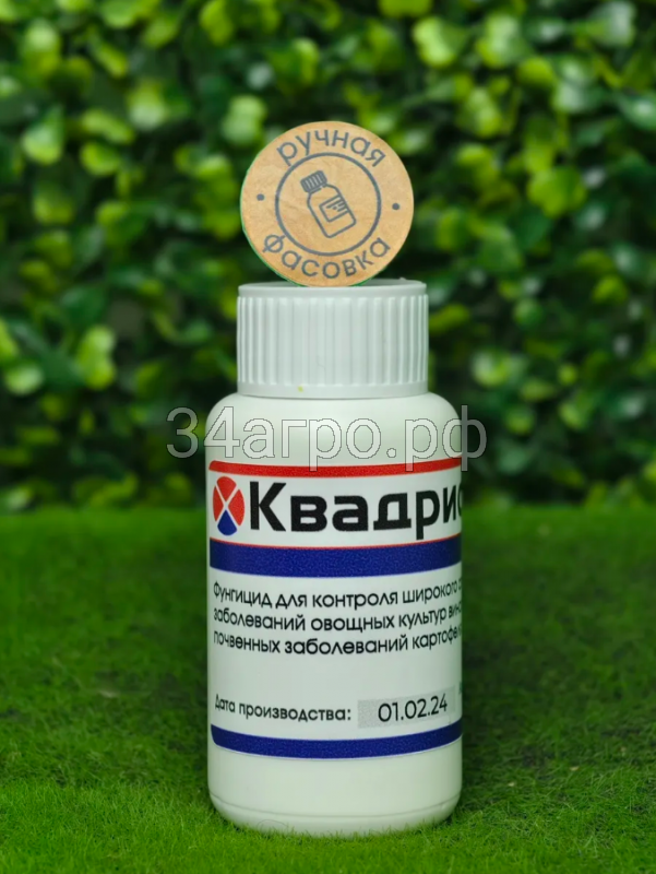 Квадрис, СК (суспензионный концентрат) - содержит 250 гр/кг азоксистробина. Фунгицид от компании Syngenta для защиты овощных культур и винограда от широкого спектра грибковых болезней. Препарат оказывает антиспорулирующее и ингибирующее влияние на прорастающие спор патогена, действует как на внешней стороне листа, так и внутри его.