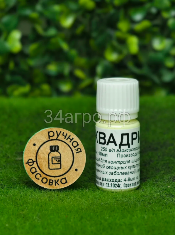Квадрис, СК (суспензионный концентрат) - содержит 250 гр/кг азоксистробина. Фунгицид от компании Syngenta для защиты овощных культур и винограда от широкого спектра грибковых болезней. Препарат оказывает антиспорулирующее и ингибирующее влияние на прорастающие спор патогена, действует как на внешней стороне листа, так и внутри его.
