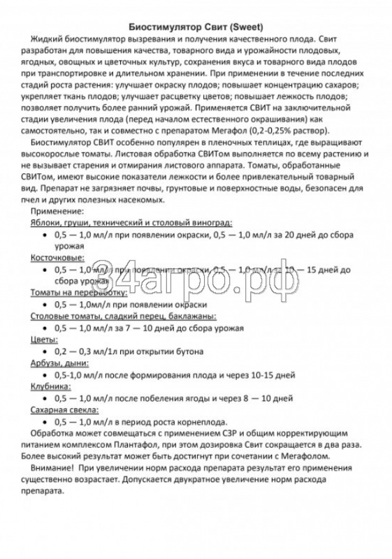Применение на цветах улучшает окраску и яркость бутона, повышает период сохранности после срезки. Свит разработан для повышения качества, товарного вида и урожайности плодовых, ягодных, овощных и цветочных культур, сохранения вкуса и товарного вида плодов при транспортировке и длительном хранении.
