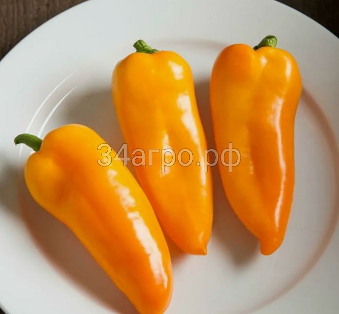 Плод: крупный, конусовидной формы, массой 90–110 г. Окраска: в технической спелости зелёная, в биологической — оранжевая. Поверхность гладкая, толщина стенки — 6–6,5 мм. Количество камер — 2–3. Мякоть сочная.